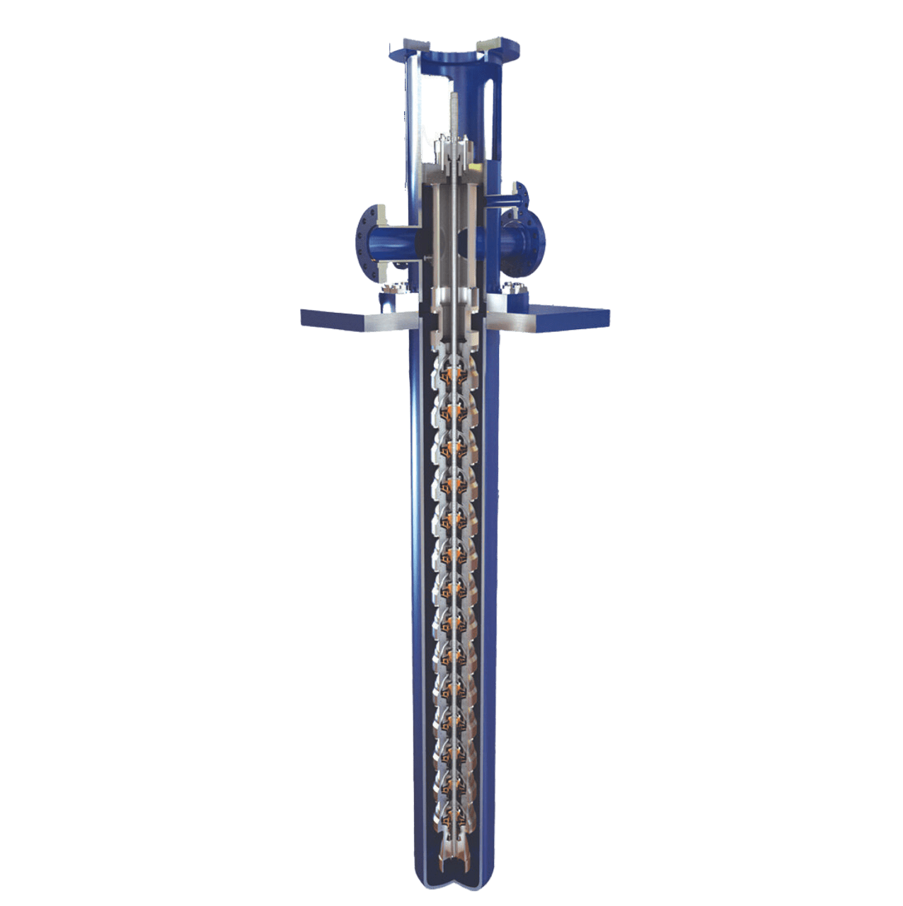 Los generadores verticales tipo turbina de Ruhrpumpen en realidad son bombas de funcionamiento inverso. Cuando el flujo que pasa por la bomba se invierte, el inversor comienza a girar en dirección opuesta y la bomba funciona como una turbina.