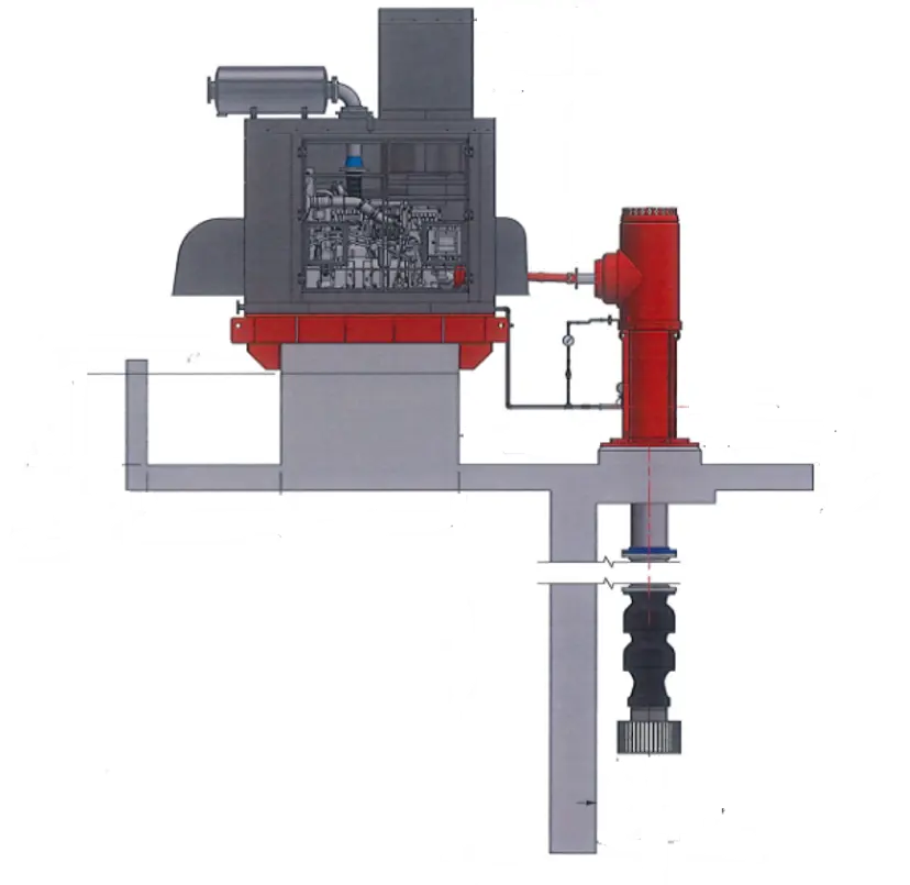 The vertical turbine portrayed above is a Ruhrpumpen VTP model size 20C-600, with a rated flow of 3,500 gpm, equipped with a noise enclosure to provide noise attenuation to the engine as well as protection from the environment.