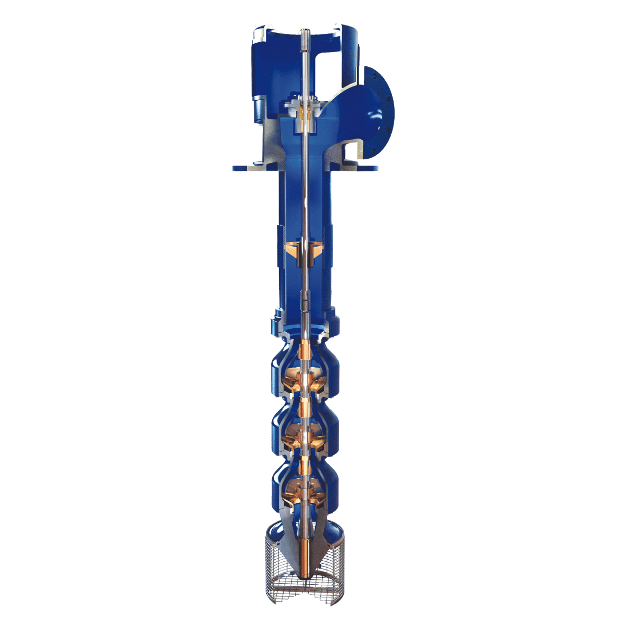 The VTP pump line is normally designed to operate in wells or sumps. Its bowl assembly consists primarily of a suction case or bell, one or more pump bowls and a discharge case. The pump bowl assembly is positioned in the sump or well at a depth to provide the proper submergence.