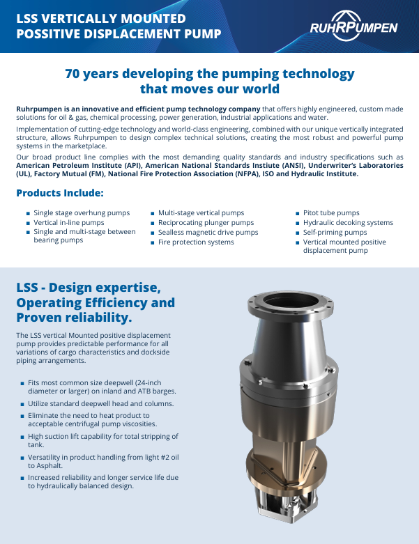 The LSS vertical Mounted positive displacement pump provides predictable performance for all variations of cargo characteristics and dockside piping arrangements.
